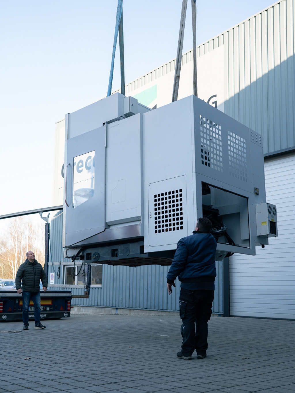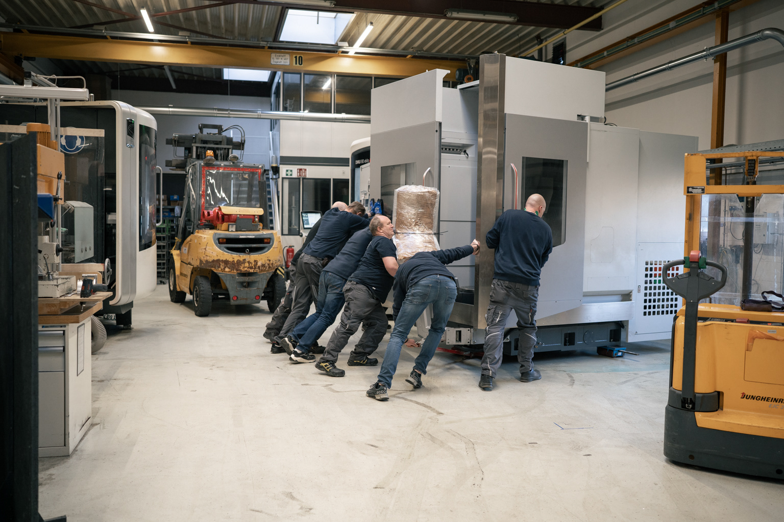 Um für unsere Kunden immer auf dem neusten Stand zu bleiben, haben wir im Jahr 2025 in eine neue CNC-Fräse inklusive Automation investiert. Kurz vor Weihnachten war es dann endlich soweit: Abtransport zweier Bestandsmaschinen, die Platz für das neue Fräszentrum geschaffen haben. Mit vereinten Kräften hat die neue Maschine dann ihren neuen Bestimmungsort erreicht, um Anfang 2026 eingerichtet und in Betrieb genommen zu werden.